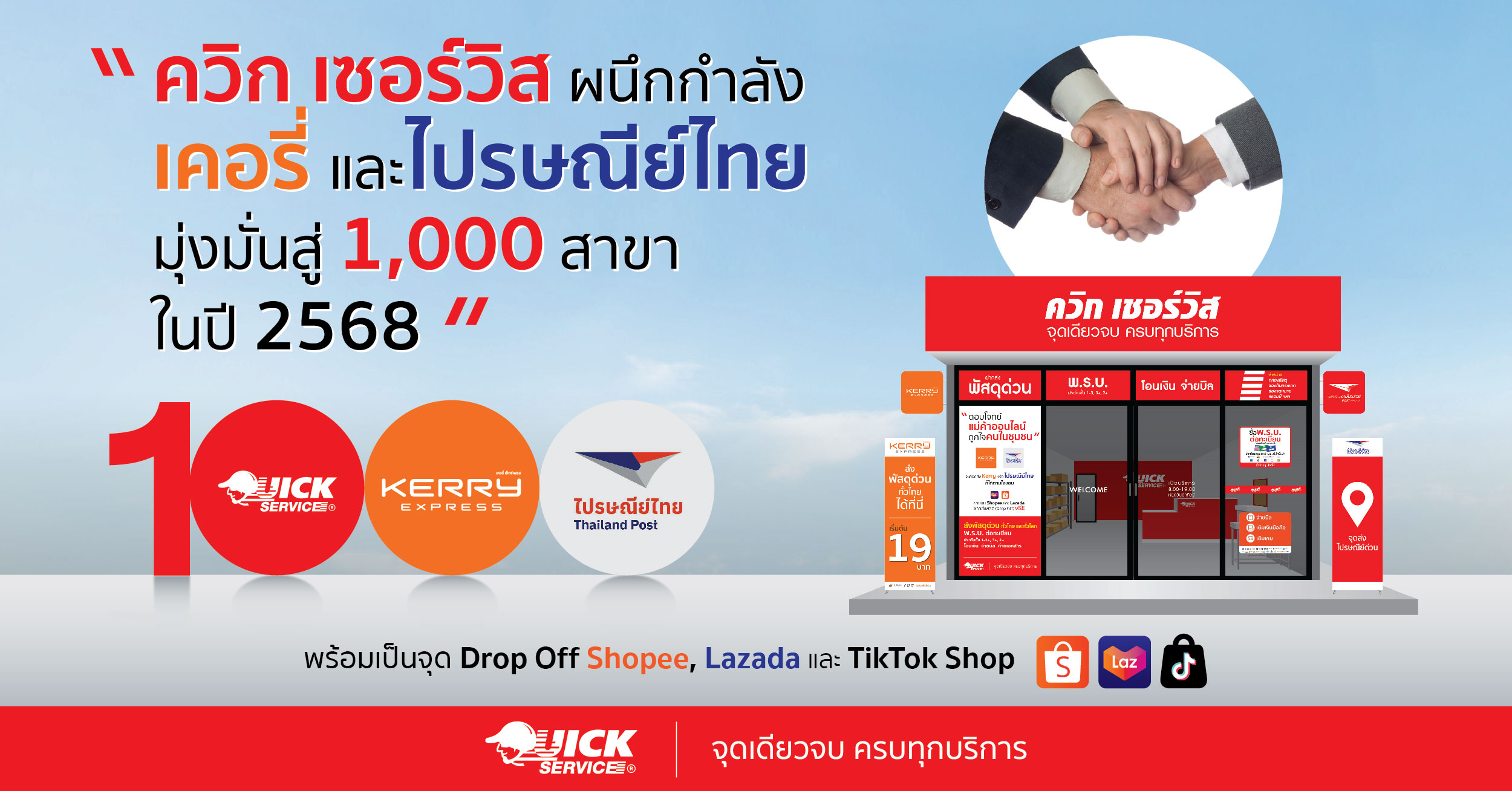 “ควิก เซอร์วิส” แฟรนไชส์ร้านรับ-ส่งพัสดุด่วนและจุดบริการชุมชนครบวงจร ผนึกกำลังกับ “เคอรี่ เอ็กซ์เพรส” และ “ไปรษณีย์ไทย” สองบริษัทขนส่งพัสดุชั้นนำ อันดับ 1 และอันดับ 2 ของไทย รุกตลาด!!